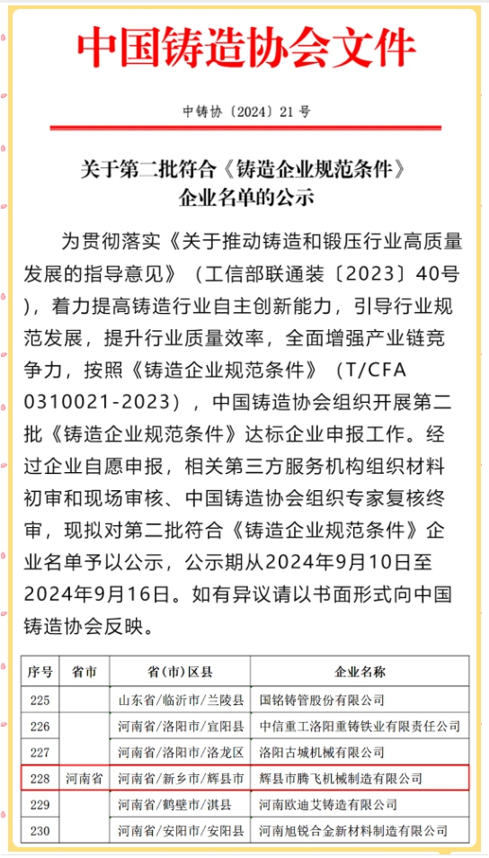 9月11日,中國鑄造協(xié)會官網(wǎng)發(fā)布“第二批符合《鑄造企業(yè)規(guī)范條件》企業(yè)名單的公示”,輝縣市騰飛機械制造有限公司榜上有名。
